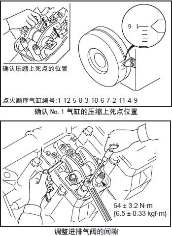注:(a) 從三菱S12柴油發(fā)動(dòng)機(jī)凸輪軸側(cè)面向三菱S12柴油發(fā)動(dòng)機(jī)氣缸頭,左側(cè)是進(jìn)氣門,右側(cè)是排氣門。(b) 氣門間隙的標(biāo)準(zhǔn)值指示在No.1 三菱S12柴油發(fā)動(dòng)機(jī)氣缸的搖臂罩的說明牌上。
