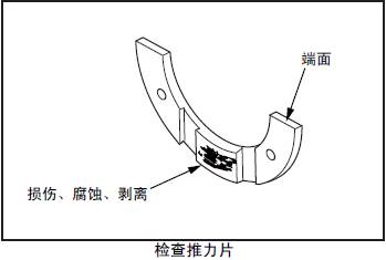 檢查三菱R16柴油發(fā)動機推力片的接觸面、背面和端面,如有接觸不良、滑動損傷、腐蝕、異物嵌入等異常時更換新品。