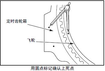 (3) No.1 氣缸上死點的確認(rèn)方法是,在三菱R16柴油發(fā)動機(jī)飛輪端面和三菱R16柴油發(fā)動機(jī)正時齒輪箱上打刻有圓點標(biāo)記,當(dāng)3 點之間的距離相同的時候,既是No.1 氣缸的上死點。