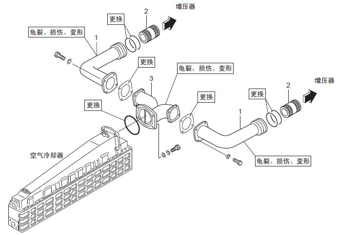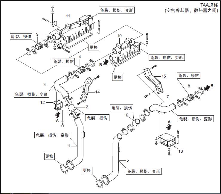 TAA規(guī)格(三菱S16柴油機(jī)空氣冷卻器、三菱R16柴油發(fā)動(dòng)機(jī)三菱R16柴油發(fā)動(dòng)機(jī)缸體之間) 空氣管的拆卸,檢修
