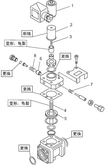 用壓縮空氣(0.29 ~ 0.49MPa{3 ~ 5 kgf/cm2} 以下) 沿通常的空氣流向的相反方向吹入,吹除粘著物同時(shí)檢查有無(wú)腐蝕或龜裂。