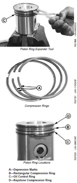 1. When installing new piston rings, use JDE85, JDE135,or KJD10140 Piston Ring Expander. Install oil ringexpander in bottom ring groove. Position end gaptoward either side of piston pin.
