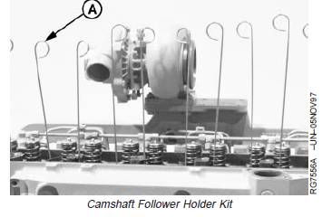 7. Revolve engine to an angle where camshaft followers fall away from camshaft or use D15001NU Magnetic Follower Holder Kit (A) to hold followers.