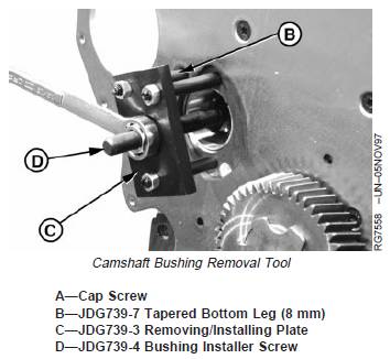11. Insert JDG739-1 Bushing Remover into camshaftbore so puller pilots in bushing ID and JDG739-4Bushing Installer Screw (D) extends through plate.