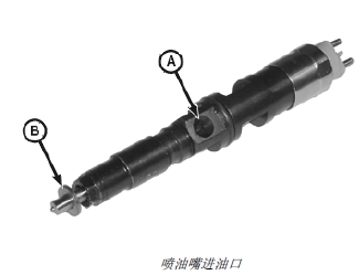 6. 安裝噴油嘴線束,用螺母(A) 將導(dǎo)線固定在噴油嘴上,并用螺釘 (B) 將導(dǎo)線接頭固定在搖臂支架上。(參見 CTM230 (配有 Denso 高壓共軌的 11 級電子燃油系統(tǒng))第 02 部分第 090 章的“安裝電子噴油嘴”部分。)