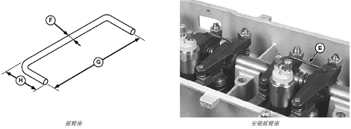 重要提示: 安裝過程中,放松搖臂上的調(diào)節(jié)螺釘可避免損壞搖臂軸。為有助于安裝搖臂軸總成,要使用搖臂座(E),如圖所示。