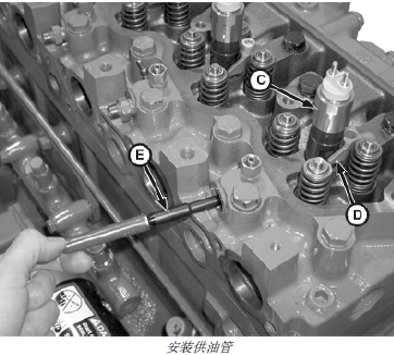 2. 安裝噴油嘴,將噴油嘴的固定卡子(D) 固定在缸蓋上。安裝后,噴油嘴的的進(jìn)油口 (A) 一定要對著供油管 (E)。