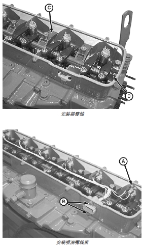 4. 用機(jī)油潤滑搖臂部件和推桿座,確保部件靈活轉(zhuǎn)動(dòng)。將兩端的卡箍螺釘涂上 LOCTITE® 242 螺紋緊固劑和密封劑。按技術(shù)規(guī)格的要求擰緊搖臂軸兩端的卡箍(D)。