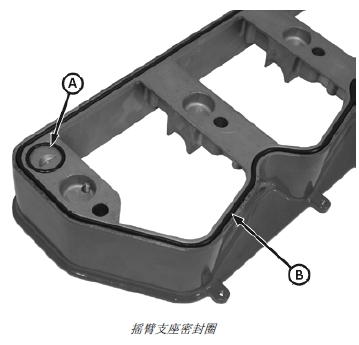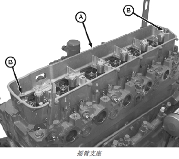 重要提示: John Deere約翰迪爾強(qiáng)鹿柴油發(fā)動(dòng)機(jī)或缸蓋大修期間,每次拆下支座后,都要更換 O 形密封環(huán) (B) 和搖臂供油O 形環(huán) (A)。