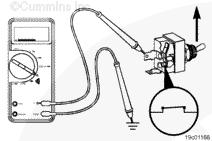 調(diào)整萬用表以便測量電阻。將一根測試導(dǎo)線插入 OEM 線束接頭上的最大康明斯ISB5.9 G CM2180 發(fā)動機轉(zhuǎn)速開關(guān)信號觸針,然后將其連接到一支萬用表表筆。使萬用表的另一根表筆接觸康明斯ISB5.9 G CM2180 發(fā)動機缸體接地。