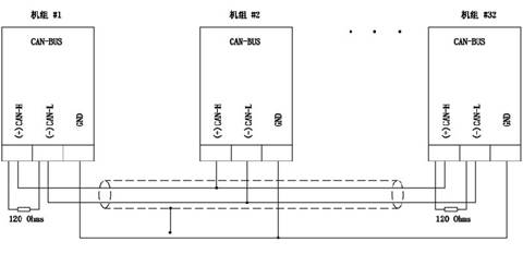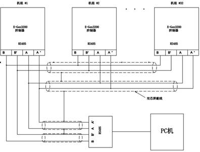 并機系統(tǒng)中的機組之間的起停順序、負載分配、開關閉合時間等各種功能都是通過各并機并網(wǎng)并聯(lián)控制器的數(shù)據(jù)聯(lián)機進行通信,然后由控制器進行數(shù)據(jù)處理并發(fā)出相應控制命令,從而實現(xiàn)對各機組的并車控制。通信采用 RS-485網(wǎng)絡,其在并機并網(wǎng)并聯(lián)控制器中的聯(lián)機示意圖如下: