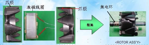 3). 轉(zhuǎn)子: 激磁線圈兩端各自連接在SLIP RING,依據(jù)發(fā)動(dòng)機(jī)旋轉(zhuǎn)并通過刷子收到激磁電流而爪極被磁化(N,S極)使定子里產(chǎn)生交流電流.