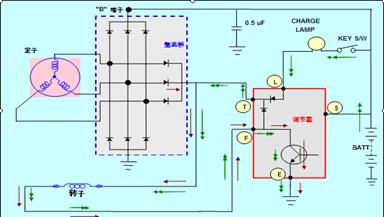 發(fā)動(dòng)機(jī) IDLE期間引加急劇電流則調(diào)節(jié)器防止發(fā)動(dòng)機(jī)IDLE速度,并為了避免發(fā)動(dòng)機(jī)負(fù)載的突然增大,而把轉(zhuǎn)子激磁電流切斷以后逐漸增加電流來減少發(fā)動(dòng)機(jī)的速度變化. 依據(jù)此動(dòng)作 調(diào)節(jié)器在提高燃比和減少 排廢氣及改善乘車感的方面作出貢獻(xiàn).