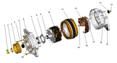1.螺母 2.彈簧墊圈 3.皮帶輪 4.貫通螺栓 5.限位圈 6.驅(qū)動(dòng)端蓋 7.軸承 8.軸承蓋 9.限位圈 10.轉(zhuǎn)子 11.定子 12.調(diào)節(jié)器 13.絕緣套 14.螺母 15.補(bǔ)償套 16.電刷端蓋 17.整流橋 18.螺釘 19.螺釘