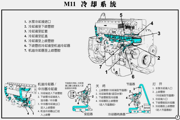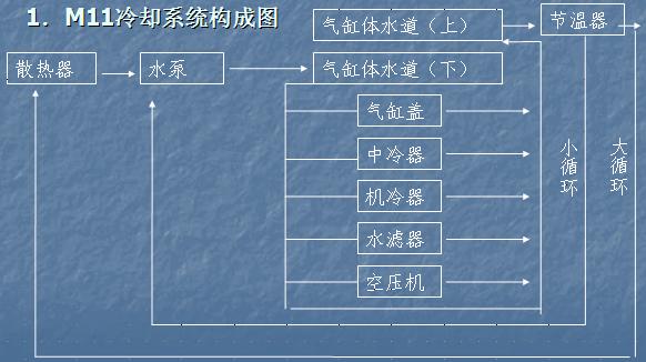 由散熱器、水泵、氣缸體水道、氣缸蓋水道、出水管、節(jié)溫器、水濾器、中冷器、機油冷卻器、以及選用件空氣壓縮機、液壓油冷卻器。