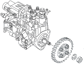 不要松開將噴油泵驅(qū)動齒輪固定在噴油泵輪轂上的四個螺栓。不要將驅(qū)動齒輪從輪轂上拆下來。準(zhǔn)確的噴油泵正時幾乎很難達(dá)到。僅拆下驅(qū)動齒輪螺母和密封圈, 將輪轂留在齒輪上。