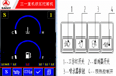 l  右操作面板黃色指示燈為發(fā)動機預(yù)熱指示燈,通過閉合位于后面的翹板開關(guān),并將點火開關(guān)打到ON-START之間的預(yù)熱位置,此時指示燈亮,表示開始預(yù)熱。
