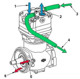 空氣壓縮機(jī)連續(xù)運(yùn)行,但有“負(fù)載”和“空載”兩種運(yùn)行模式。工作模式由壓力驅(qū)動調(diào)壓器和壓縮機(jī)卸荷閥總成控制。當(dāng)空氣系統(tǒng)達(dá)到預(yù)定壓力時(shí),調(diào)壓器給卸荷閥總成施加一個(gè)空氣信號,使得卸荷閥打開或者關(guān)閉壓縮機(jī)進(jìn)氣門,于是壓縮空氣停止流入空氣系統(tǒng)。當(dāng)使用系統(tǒng)時(shí),壓力下降。在預(yù)定壓力下,調(diào)壓器給壓縮機(jī)卸荷閥總成發(fā)出空氣信號,允許壓縮機(jī)再次向空氣系統(tǒng)泵入壓縮空氣。