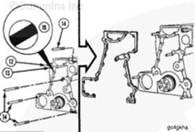 安裝金剛石定位銷 (15) 時(shí)必須使平面轉(zhuǎn)向缸體右下角的主定位銷孔。將康明斯KTA柴油發(fā)動(dòng)機(jī)導(dǎo)向雙頭螺栓 (14) 安裝到缸體中。將少量康明斯密封膠(零件號(hào) 3164067)或等同物涂抹到密封墊兩側(cè)的對(duì)接接合處。安裝密封墊。密封墊必須與缸體和隔板的底部平齊。