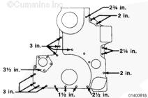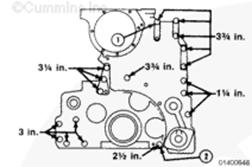 圖中所示為所有鑄鐵兩件式(船用)前齒輪室蓋的通用螺釘長(zhǎng)度要求。(1) 至 (9) 的螺釘長(zhǎng)度取決于所用的選裝件。所有螺釘都以美制英寸為單位。所有螺釘都為 3/8 x 16 UNC。
