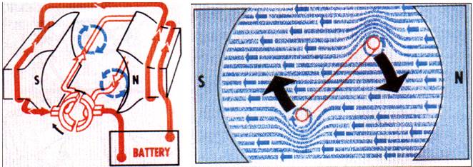 l          把電路環(huán)線置于兩磁極中。電流流向:蓄電池正→磁極線圈→ 碳刷→ 換向器→電路環(huán)線 → 換向器→碳刷 →蓄電池負(fù)