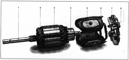 l          1、轉(zhuǎn)子軸   2、轉(zhuǎn)子線圈   3、轉(zhuǎn)子磁芯   4、換向器  5、磁極靴   6、磁場線圈   7、碳刷   8、碳刷架