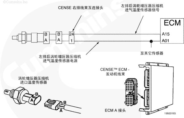 左排后渦輪增壓器壓縮機(jī)進(jìn)口溫度傳感器向 CENSE™ ECM 提供左排后渦輪增壓器壓縮機(jī)進(jìn)口溫度信號。傳感器的電阻值隨溫度變化。CENSE™ ECM 通過監(jiān)測與傳感器串連的內(nèi)部電阻器兩端的電壓檢測傳感器電阻的變化。內(nèi)部電阻器兩端電壓的變化被轉(zhuǎn)換成溫度的變化。