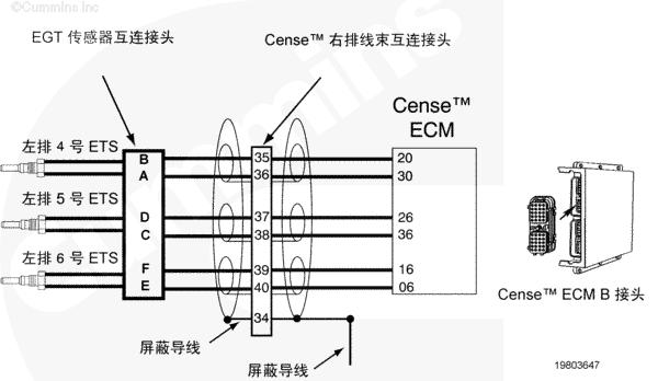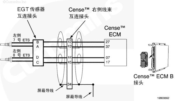 排氣溫度傳感器電路圖向 CENSE™ ECM 提供排氣溫度信號。排氣溫度傳感器為熱電偶。熱電偶是將兩種不同的金屬焊接起來構(gòu)成的。接合點(diǎn)隨溫度變化產(chǎn)生極小的電壓。