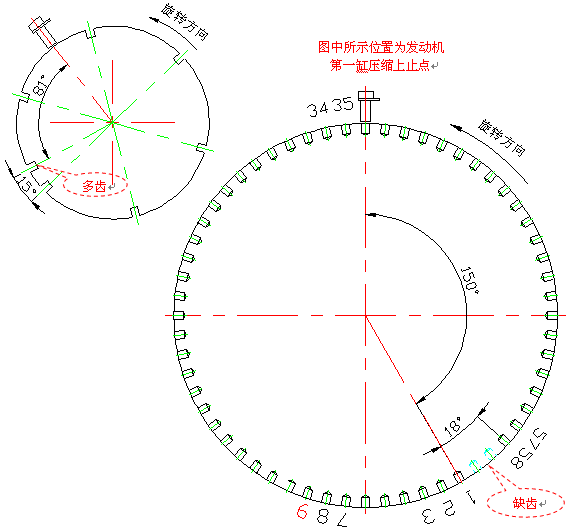 Ø 凸輪軸傳感器對(duì)準(zhǔn)凸輪信號(hào)盤(pán)的多齒時(shí),曲軸傳感器應(yīng)對(duì)準(zhǔn)曲軸信號(hào)盤(pán)缺齒后的第9齒,反過(guò)來(lái)不一定有這種關(guān)系。
