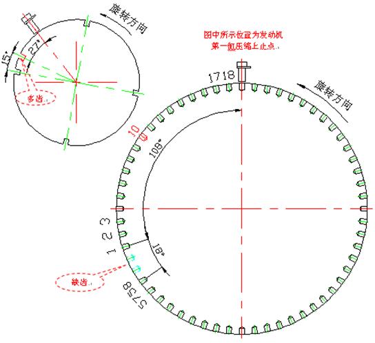 Ø 曲軸傳感器應(yīng)該指示到曲軸信號(hào)盤(pán)缺齒后的第19個(gè)齒(參見(jiàn)圖中齒的編號(hào)),或缺齒后108°(曲軸轉(zhuǎn)角)的位置