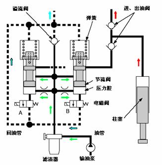 ④當(dāng)電磁閥A和B根據(jù)來(lái)自ECU的信號(hào)被賦予了電壓后,壓力腔側(cè)回油通道打開(kāi)了,在壓力腔的的油從側(cè)回油通道流出。