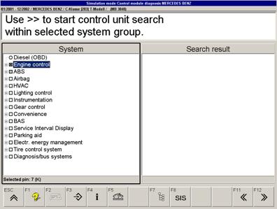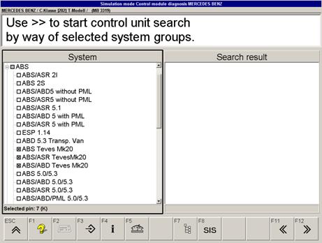 如果名稱前面的框有一灰色背景,在此組列出的系統(tǒng)在自動組搜索不能發(fā)現(xiàn)。 (通過點擊加符號或F7可以獲得清單)。如果安裝在車上的控制單元在組搜索時不能被找到,相關的控制單元必須在清單中手動選擇。通過F7, 你可以打開或關閉自動選擇。