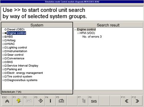 對于控制單元搜索, 發(fā)動機控制單元組已被選擇。(在選擇框畫線到名稱上)。如果要求進行其他的控制單元搜索, (gas 或diesel OBD), 這一組必須被選擇(在其名稱前面的圓圈中帶點)。