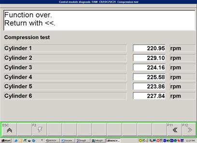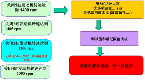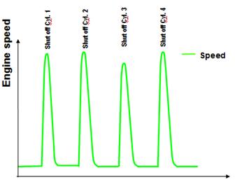 缸壓測試時,ECU停止對發(fā)動機的噴油。起動機帶動發(fā)動機運轉。電腦同時測量各缸壓縮,膨脹階段的轉速。
