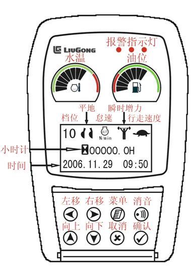 2、  在調(diào)試儀表的菜單中選擇其他測試,選擇開始測試,此時(shí)水溫液晶顯示1段,燃油液晶顯示2段,檔位10,出現(xiàn)平地模式、自動怠速、瞬時(shí)增力、行走慢的圖標(biāo),同時(shí)電壓高報(bào)警,機(jī)油壓力低報(bào)警,液壓油溫高報(bào)警,報(bào)警燈閃爍,蜂鳴器鳴叫,按消音鍵消音。
