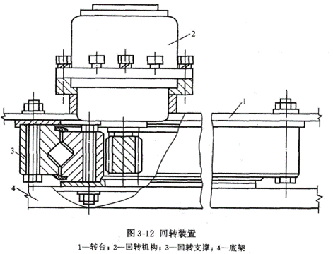 單斗液壓挖掘機(jī)用回轉(zhuǎn)支撐的結(jié)構(gòu)型式,實(shí)現(xiàn)上部平臺的回轉(zhuǎn),回轉(zhuǎn)支撐按結(jié)構(gòu)形式分為轉(zhuǎn)柱式和滾動軸承式等兩種,見圖3-13、圖3-14、圖3-15。