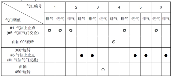 5) 當(dāng)#5 氣缸處于上止點(diǎn)時(shí),按照下面列表中“●”調(diào)整氣門間隙。