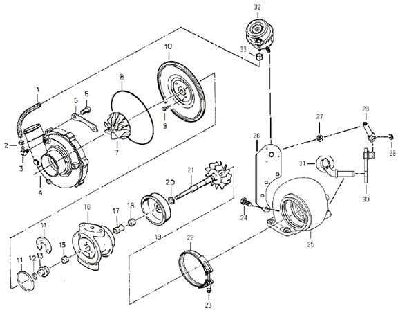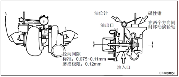 從發(fā)動機(jī)上拆下渦輪增壓器,然后檢查轉(zhuǎn)子軸向間隙或徑向間隙。拆下發(fā)動機(jī)時,確保塞好進(jìn)油和出油端口。