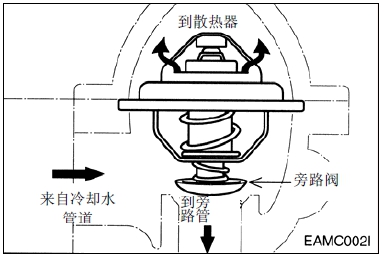 節(jié) 溫 器 保 持 冷 卻 液 的 固 定 溫 度 在(90∼95°C)并通過防止熱量損失來提高發(fā)動機(jī)熱效率。即當(dāng)冷卻液溫度低時,節(jié)溫器閥門被關(guān)閉以使得冷卻液經(jīng)旁路直接進(jìn)入水泵。當(dāng)冷卻液溫度升高到打開節(jié)溫器閥門時的溫度, 旁路被關(guān)閉,通住散熱器的水道被打開以便冷卻液受壓流入散熱器。