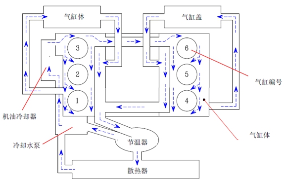 閥門打開溫度時,水就會循環(huán)到水泵;而水溫高于閥門打開溫度時,水就會循環(huán)到散熱器。在散熱器中,冷卻液吸收的熱量散發(fā)出去,待冷卻液冷卻以后循環(huán)回水泵。