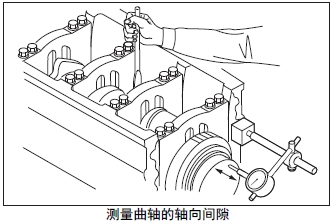 測(cè)量推力片的厚度。超過(guò)極限值時(shí)更換新的推力片。根據(jù)曲軸的磨損程度,在曲軸重新研磨使用時(shí),使用加大尺寸的推力片。曲軸的研磨要領(lǐng)參考「發(fā)動(dòng)機(jī)本體的檢測(cè)、修理」的「最后端曲軸頸的軸頸寬度研磨」項(xiàng)。
