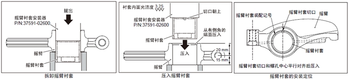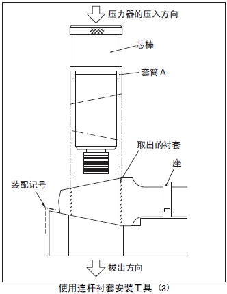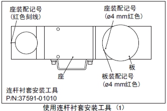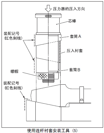 (2) 套筒A裝入心軸,套筒A的裝配記號(hào)(紅色刻線)對(duì)準(zhǔn)座臺(tái)的裝配記號(hào)(紅色刻線)后安裝在連桿襯套內(nèi)。