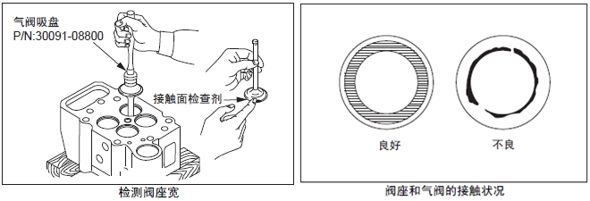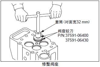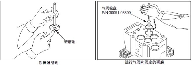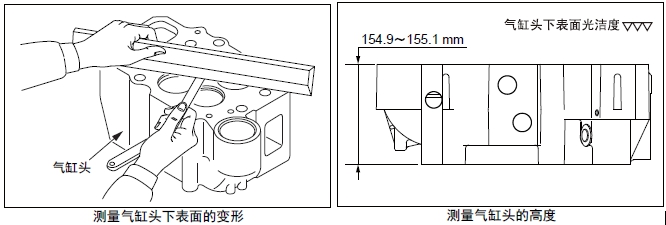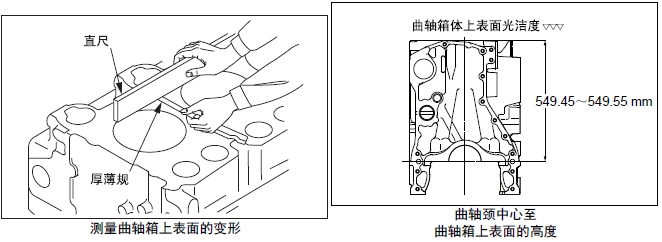 在曲軸箱的上表面放置直尺,用厚薄規(guī)測(cè)量變形量。超過(guò)極限值時(shí),更換新品或研磨修整。進(jìn)行研磨修整時(shí),要記錄最大研磨量。另外,氣缸頭下面進(jìn)行研磨修整時(shí),合計(jì)的最大研磨量限定在0.50 mm以內(nèi)。