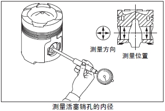 測(cè)量活塞銷孔的內(nèi)徑。超過(guò)極限值時(shí)更換新活塞。