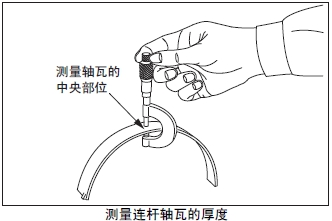 測(cè)量連桿軸瓦的中央部位的厚度。超過(guò)極限值時(shí),將軸瓦上下整套更換。根據(jù)曲柄銷的磨損程度,在曲軸重新研磨使用時(shí),使用減小尺寸的軸瓦。曲軸的研磨要領(lǐng)參考「發(fā)動(dòng)機(jī)本體的檢測(cè)、修理」的「曲軸的曲柄銷和曲軸頸的研磨」項(xiàng)。