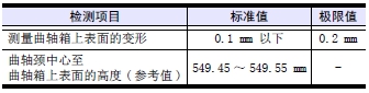 (1) 測(cè)量曲軸的曲柄銷和曲軸頸的外徑。超過(guò)極限值時(shí),使用減小尺寸的軸瓦,按照和減小尺寸軸瓦的規(guī)格研磨曲軸。使用-1.00 mm 規(guī)格的減小尺寸主軸瓦仍然超出極限值時(shí),更換新的曲軸。