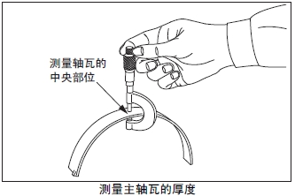 測(cè)量主軸瓦的中央部位的厚度。超過(guò)極限值時(shí),將主軸瓦上下整套更換。根據(jù)曲軸頸的磨損程度,在曲軸重新研磨使用時(shí),使用減小尺寸的主軸瓦。曲軸的研磨要領(lǐng)參考「發(fā)動(dòng)機(jī)本體的檢測(cè)、修理」的「曲軸的曲柄銷和曲軸頸的研磨」項(xiàng)。