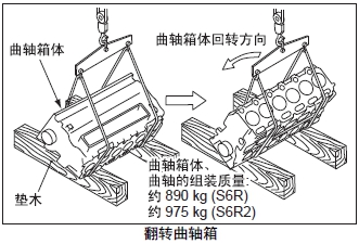 將曲軸箱放置在回轉(zhuǎn)臺(tái)上翻轉(zhuǎn)。不使用回轉(zhuǎn)臺(tái)時(shí),在曲軸箱上掛上鋼絲索,在鋼絲索和曲軸箱體之間填入墊木或布,用起吊機(jī)吊起,然后橫倒放置在枕木上。重新掛鋼絲索,在枕木上將曲軸箱體翻轉(zhuǎn)恢復(fù)常規(guī)放置狀態(tài)。