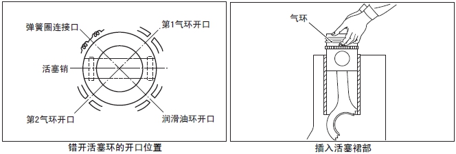 (2) 在活塞環(huán)上涂抹潤滑油?;钊h(huán)的開口要避免活塞銷方向、推力方向或反推力方向,分別錯(cuò)開放置。