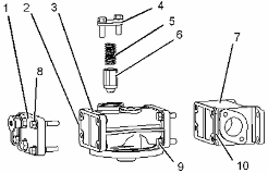 將密封墊 (10) 和接頭 (7) 安置在發(fā)動機機油濾清器底座 (3) 上,安裝螺栓 (9) 。